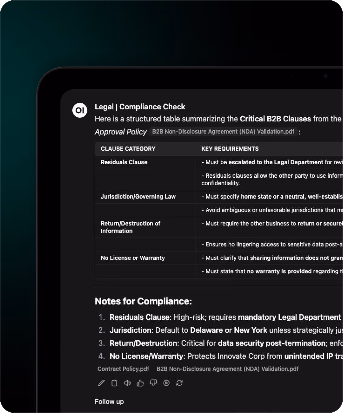 Advisors get instant, cited answers for KYC or RFPs, reducing compliance workload and speeding up approvals.