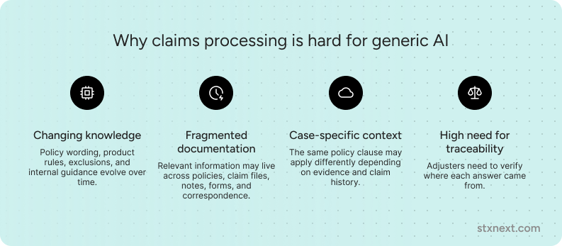 Policy wording changes, product rules evolve, exceptions accumulate, and historical claim records may conflict with current documentation. That makes claims a strong test of AI architecture: teams need answers that are fast, consistent, defensible, and grounded in current evidence.